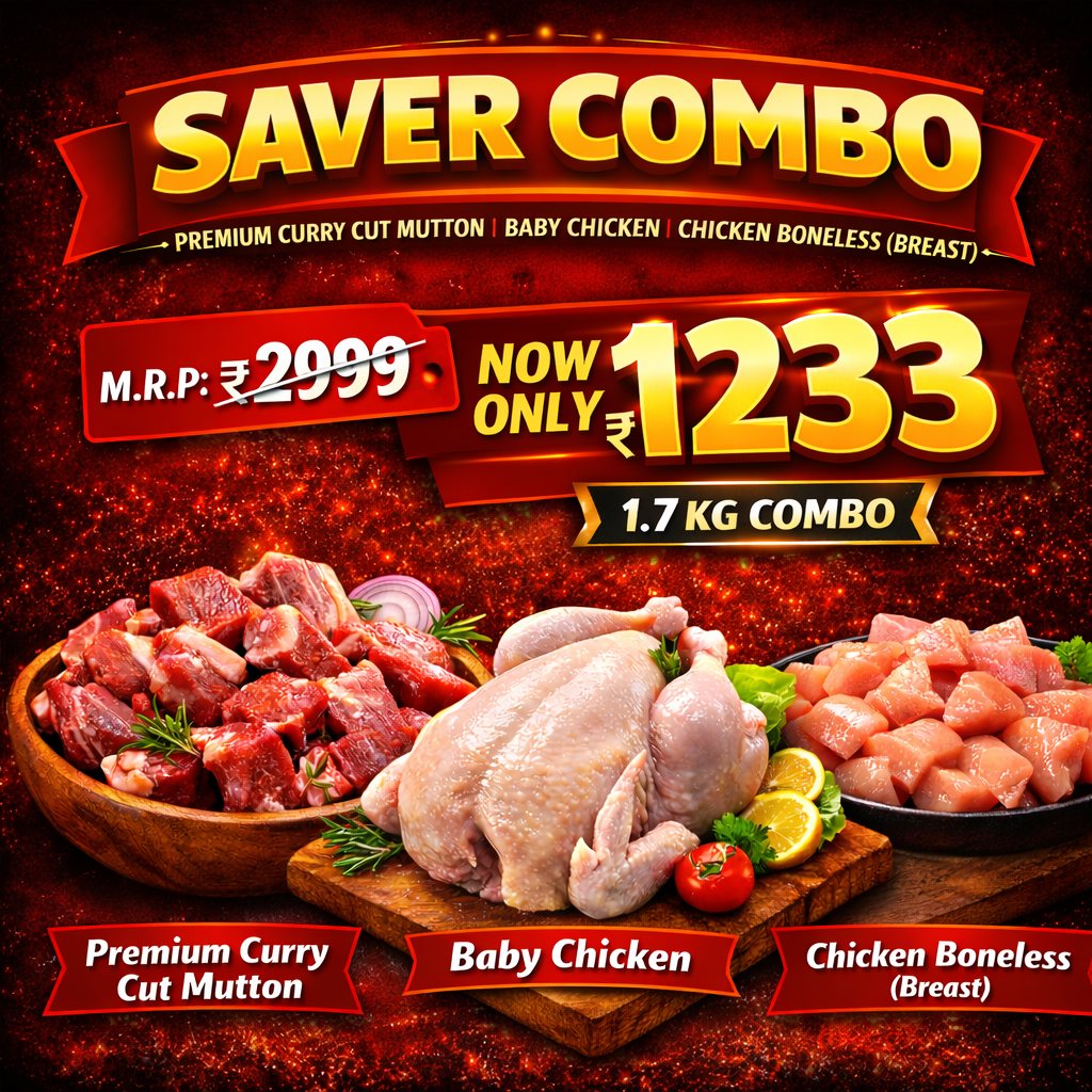 Save money without compromising quality with our Saver Combo, a thoughtfully curated 1.7kg mixed meat pack perfect for 4-5 family members. This budget-friendly combo includes premium curry cut mutton, tender baby chicken, and boneless chicken breast – everything you need for multiple delicious meals. Ideal for weekly meal planning, this value pack offers variety and convenience at an attractive price.